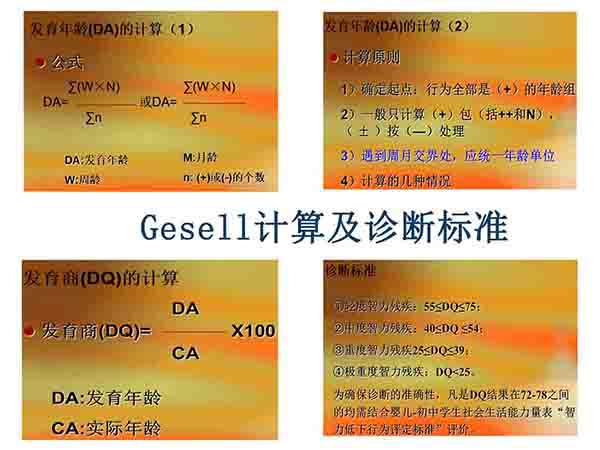 格賽爾(Gesell)智能診斷法適用于嬰幼兒。這種方法 從動(dòng)作能、應(yīng)物能、言語(yǔ)能及應(yīng)人能4個(gè)方面進(jìn)行檢查,并把4周、16周、28周、40周、52周、18個(gè)月、24個(gè)月、36個(gè)月作為8個(gè)“樞紐年齡”,即 在這些階段顯示出特殊飛躍進(jìn)展。所測(cè)得的結(jié)果,以發(fā)育商數(shù)(DQ)來(lái)表示。