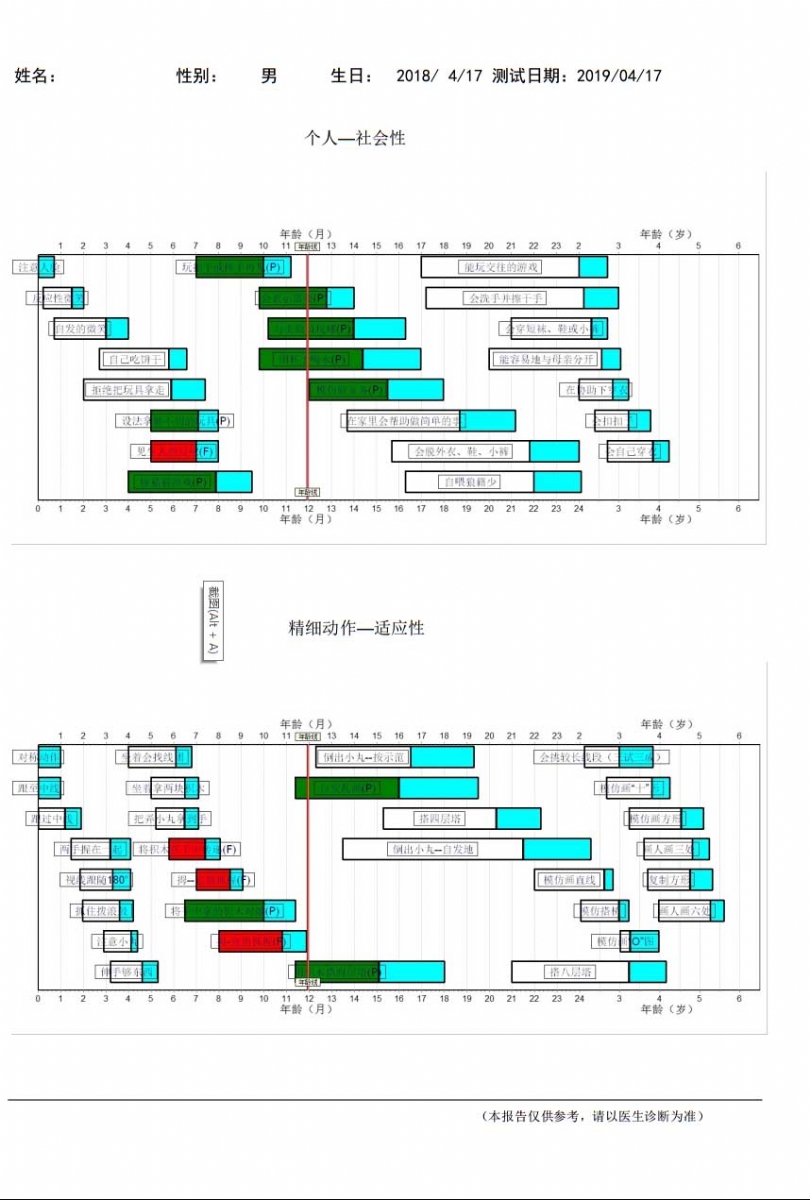 2、按照完成每個項目人數(shù)的25%、50%、75% 和90%作為標(biāo)準(zhǔn),將被查兒童與常模相比較,初步了解兒童的發(fā)育狀況。例如在某個年齡階段,90%的兒童都能掌握某項技能,而某被查兒童卻不能掌握,這一測驗結(jié)果表明該兒童在這方面的發(fā)展可能遲滯。通過一系列項目的測驗,丹佛發(fā)育篩查測驗?zāi)芴峁┰S多關(guān)于兒童心理發(fā)展?fàn)顩r的有價值的信息。