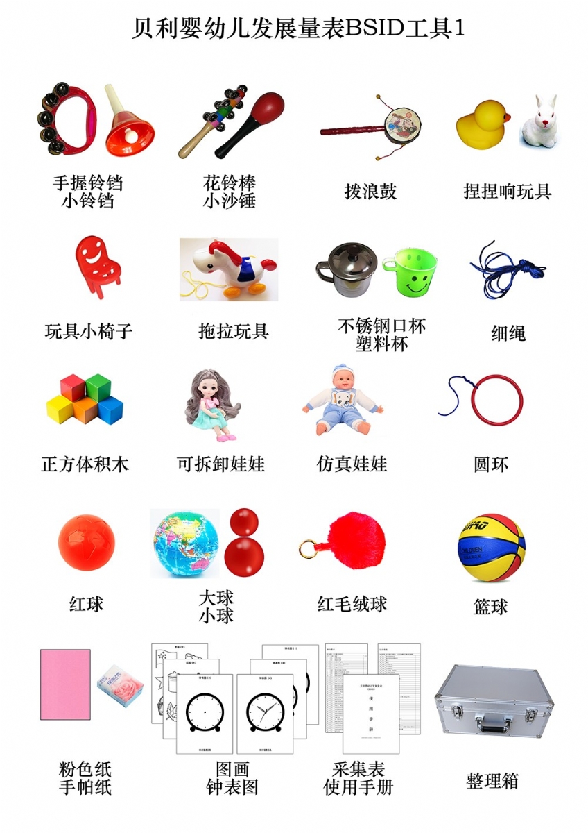 手握鈴鐺、小鈴鐺、花鈴棒、撥浪鼓、小沙錘、捏捏響玩具、玩具小椅子、拖拉玩具(帶線)、小正方體積木(紅12個,黃藍(lán)綠各2塊)、可拆卸娃娃、布娃娃、圓環(huán)、紅球、大球、紅毛絨球、籃球、紅色小球、細(xì)繩、不銹鋼口杯、塑料杯、大號塑料藥瓶、小號塑料藥瓶、餐具套裝、大小方巾、方形鏡子、大木珠(帶孔)、小木珠(帶孔、)黃方珠子、塑料方盒、塑料圓盒、油畫棒、指揮棒、黃色鉛筆、秒表、手電筒、小鬧鐘、電燈開關(guān)、頭圍尺、軟尺、木釘板、多孔型板(含圓形、方形、三角形各4塊)、幾何嵌板(含圓、三角、方形,厚8mm)、小人書識圖卡(果蔬、人物、動物、交通等)、粉色卡紙、手帕紙、鐘表圖1234、圖畫12(BSID)、BSID采集表、BSID使用手冊、整理箱等。