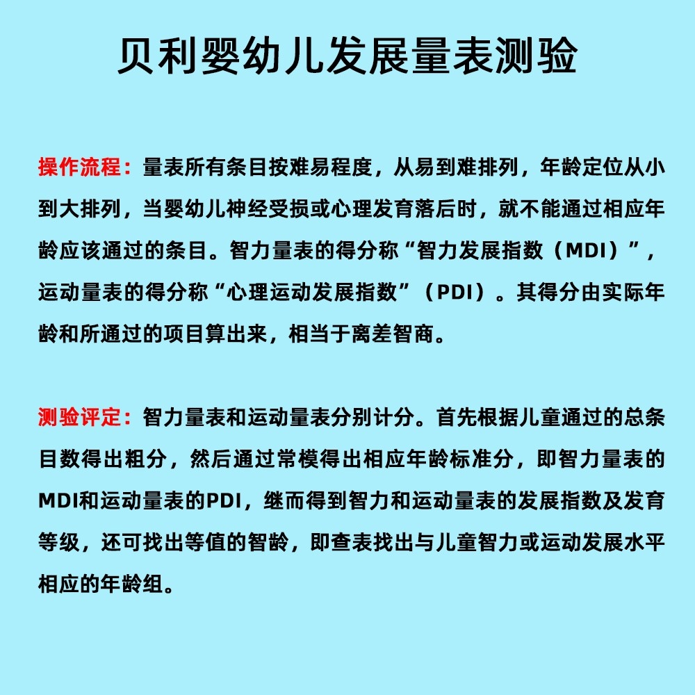量表所有條目按難易程度,從易到難排列,年齡定位從小到大排列,當(dāng)嬰幼兒神經(jīng)受損或心理發(fā)育落后時,就不能通過相應(yīng)年齡應(yīng)該通過的條目。智力量表的得分稱“智力發(fā)展指數(shù)(MDI)”,運動量表的得分稱“心理運動發(fā)展指數(shù)”(PDI)。其得分由實際年齡和所通過的項目算出來,相當(dāng)于離差智商。